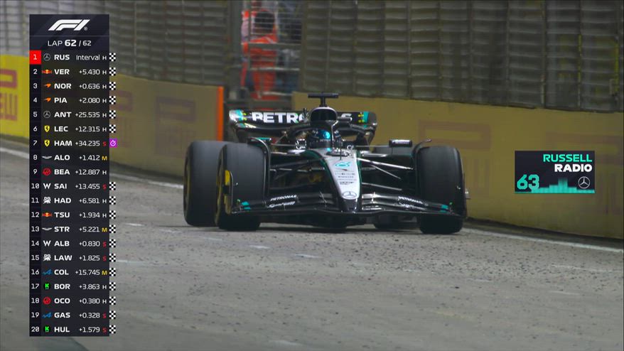 George Russell domina la diciottesima gara del Mondiale a Singapore con una prestazione impeccabile. Il britannico precede Verstappen e Norris, mentre Piastri chiude quarto dopo un contatto in partenza con Lando. Chiude la top 5 Antonelli, poi seguono le Ferrari di Leclerc e Hamilton, amareggiate dalla prestazione. McLaren festeggia il secondo titolo Costruttori consecutivo. La top 10 termina in ordine con Alonso, Bearman e uno straordinario Sainz, risalito dal fondo. La F1 torna ad Austin dal 17 al 19 ottobre LIVE su Sky e in streaming su NOW.