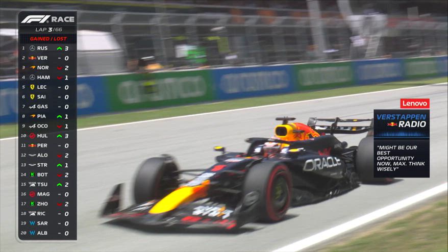 Giro 3, super sorpasso di Verstappen su Russell in Spagna
