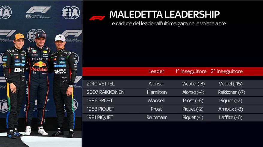 Nella grafica raccontata da Mara Sangiorgio e Roberto Chinchero, il dato che riguarda la 'leadership maledetta' in F1, con il ko nella volata a tre di chi era in testa al Mondiale: l'ultima volta è successo ad Alonso nel 2010. Una statistica da non far vedere a Lando Norris... Tutto il fine settimana sarà live su Sky e in streaming su NOW.