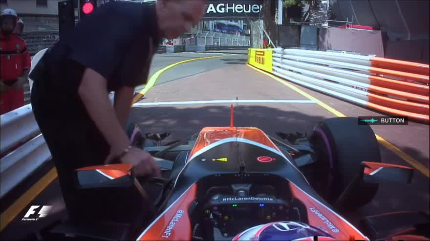 Incursione a sorpresa prima del via del GP di Monaco. Jenson Button, che sostituisce Fernando Alonso (impegnato nella 500 miglia di Indianapolis), riceve i saluti del collega spagnolo qualche istante prima della partenza.