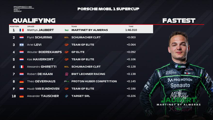 Mathys Jaubert conquista la pole position della Porsche Supercup all’Hungaroring, lasciandosi alle spalle Flynt Schuring e Ariel Levi. Quarto è Wouter Boerekamps, mentre chiude la Top 5 Kas Haverkort. Solo 6° il leader del campionato Alessandro Ghiretti, seguito da Robert De Haan. In Top 10 anche Theo Oeverhaus (8°), Huub Van Eijndhoven (9°) e Alexander Tauscher (10°). Delude Marvin Klein, 11°, mentre il primo degli italiani è Francesco Braschi, 14°. Aldo Festante è 17°, Pietro Delli Guanti 21°. Nel VIDEO i risultati completi.