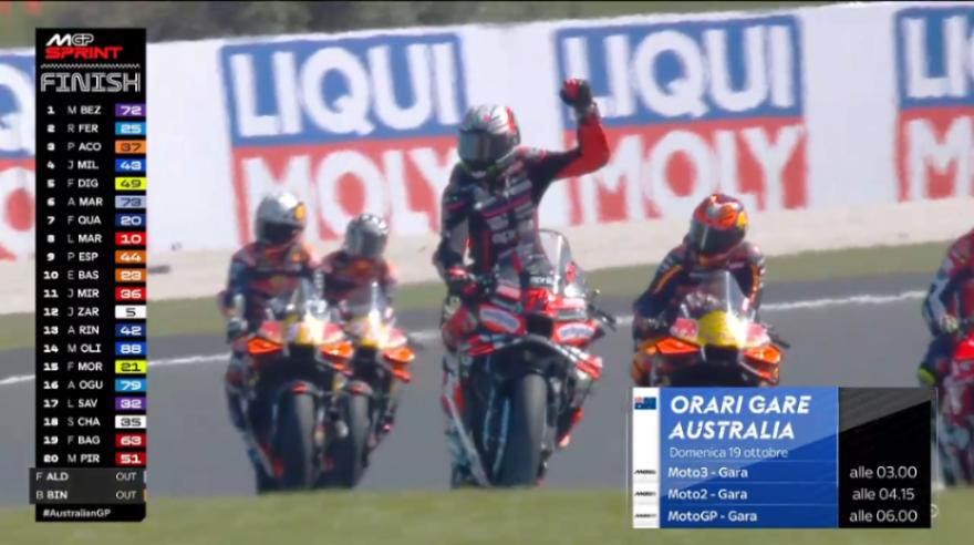 Nel VIDEO l’ultimo giro della Sprint Race di MotoGP a Phillip Island: vince Marco Bezzecchi, davanti a Raul Fernandez e a Pedro Acosta. Completano la Top 5 l'idolo di casa Jack Miller e Fabio Di Giannantonio. Pecco Bagnaia solo 18°.