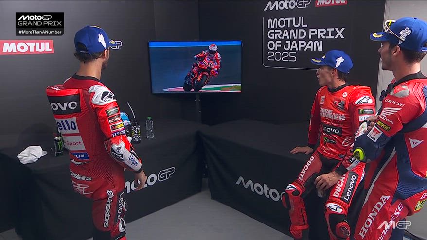 Nel VIDEO il retropodio del GP di Giappone a Motegi. Pecco Bagnaia, Marc Marquez e Joan Mir discutono della gara appena conclusa, con tanto di commento alle immagini delle fumate della Ducati di Pecco e al "Più di un numero" riferito al titolo Mondiale conquistato dallo spagnolo.