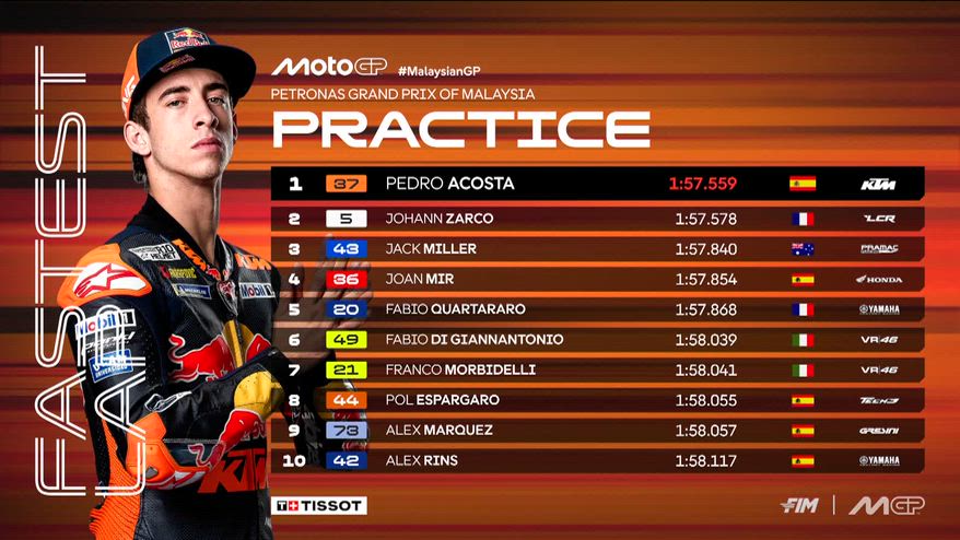 GP Malesia, Acosta 1° dopo le Pre-qualifiche: i risultati