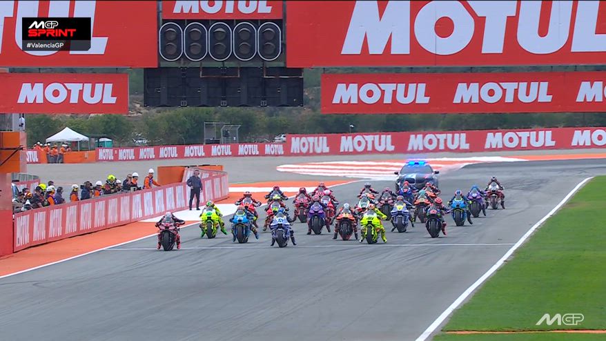 La partenza e il primo giro della Sprint Race del Gran Premio di MotoGP a Valencia.