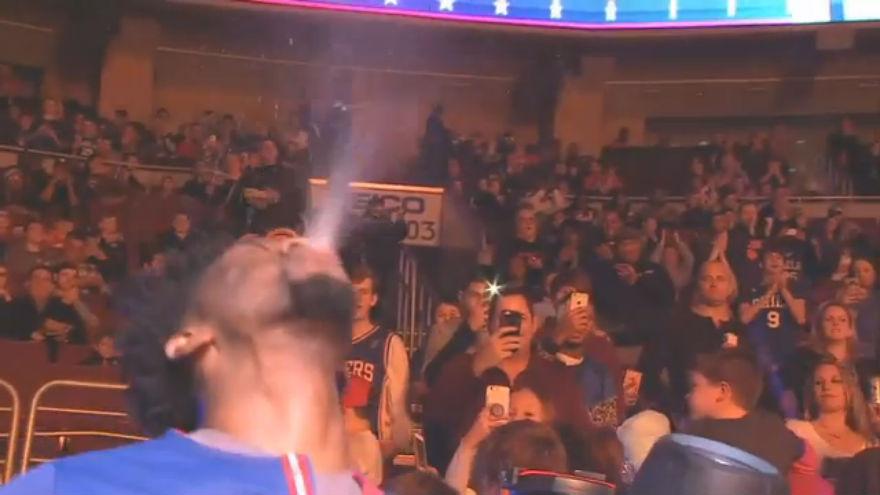 Il centro dei Sixers si presenta in campo creando una fontana d'acqua, gesto reso famoso dal leggendario wrestler WWE Triple H.