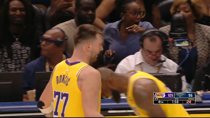 Pur condividendo con lui il campo da quasi un anno, anche LeBron James non riesce davvero a credere alle magie di Luka Doncic. A poco più di due minuti dalla fine della sfida tra Lakers e Pelicans, con il cronometro vicino allo scadere dei 24 secondi lo sloveno si è inventato un canestro “dei suoi”, raccogliendo il palleggio in uno spazio strettissimo dopo essersi nascosto dietro un blocco portato da James per segnare da nove metri e mandare i Lakers a +9, di fatto chiudendo i conti nel match. Lo stesso LeBron incredulo ha festeggiato col compagno di squadra rifilandogli una “testata” sul petto, dopo che lo sloveno aveva rivolto qualche parola infuocata a dei tifosi a bordo campo.