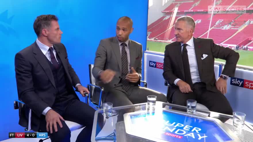 Thierry Henry and Jamie Carragher unknowingly recreate their famous "hand on knee" moment after Liverpool beat Arsenal 4-0 at Anfield.