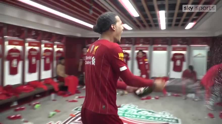 Watch the Liverpool team celebrate their title success in the Anfield changing room after their 5-3 victory over Chelsea.