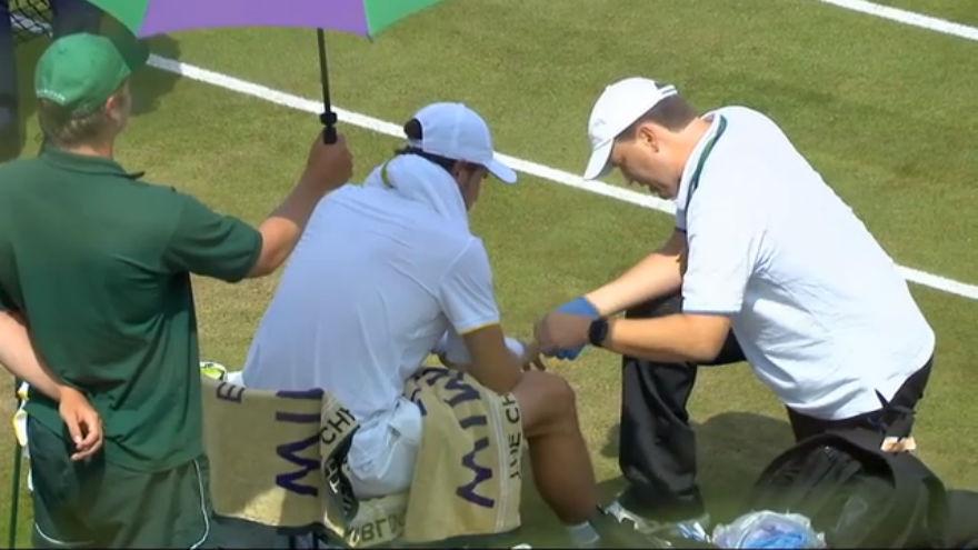 Misha Zverev colpito alla mano da uno di quegli insetti volanti che continuano a popolare questo spicchio di mondo tennistico così verde.